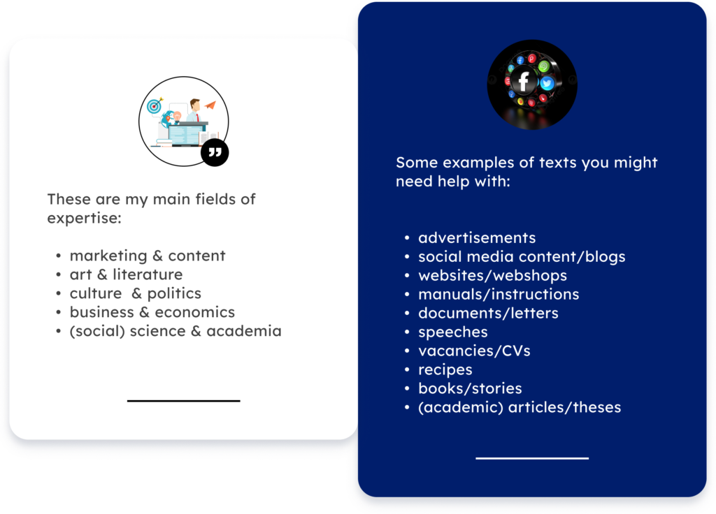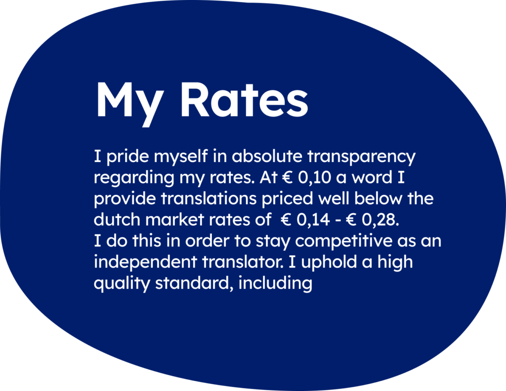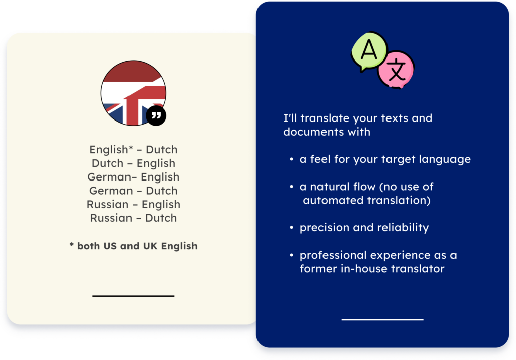 I’m a former professional in-house translator with 7+ years of experience in translation. I’m a native speaker of English and Dutch and am highly proficient in German and Russian.